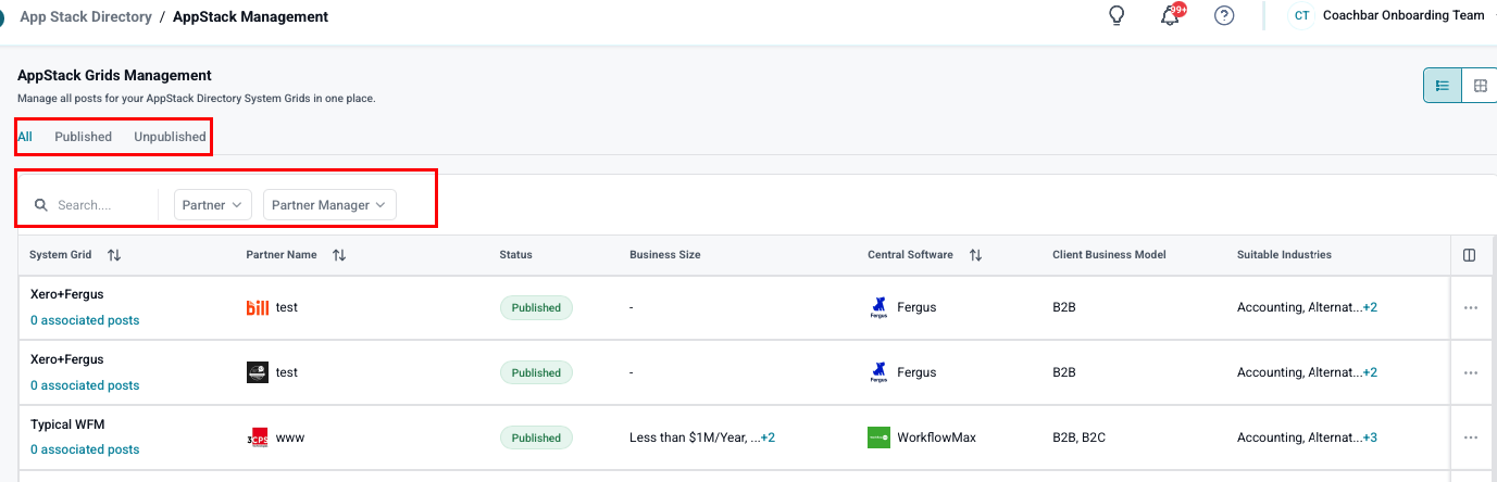 The AppStack Management section serves as the central hub for overseeing all posts and entries within the AppStack Directory, including both System Grids and Partner Profiles. The tool streamlines the organization and management of app stack data, ensuring the presentation of accurate and up-to-date information.