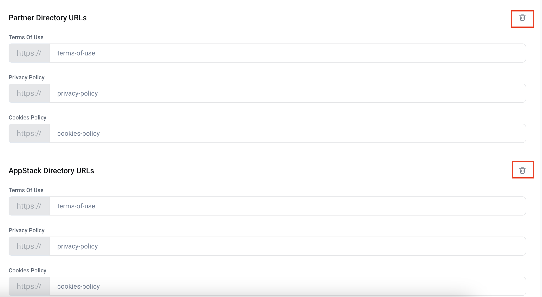 Upon subdomain creation, additional sections for each directory type appear, allowing the same three legal links to be applied specifically for:
