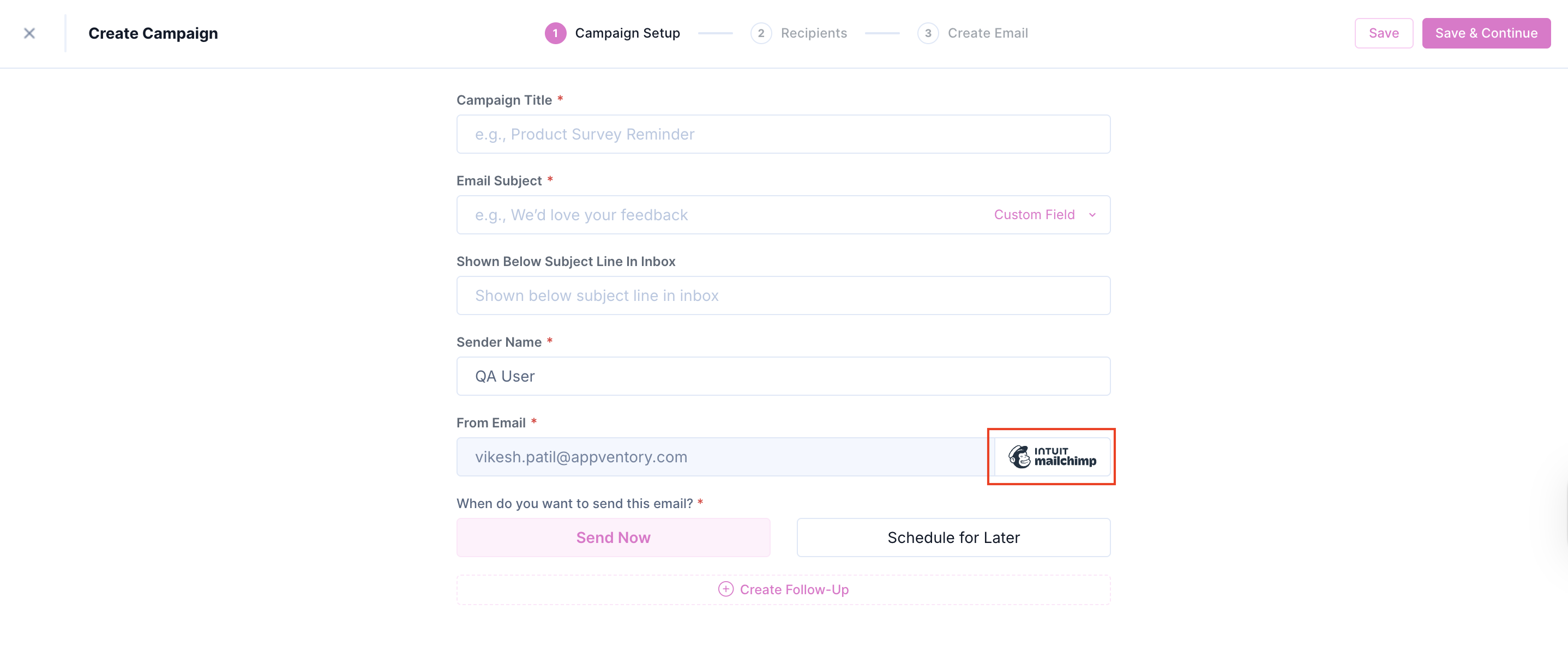 - In Campaigns, the From Email field automatically reflects the Intuit MailChimp configuration, ensuring consistent branding and delivery through MailChimp’s network.