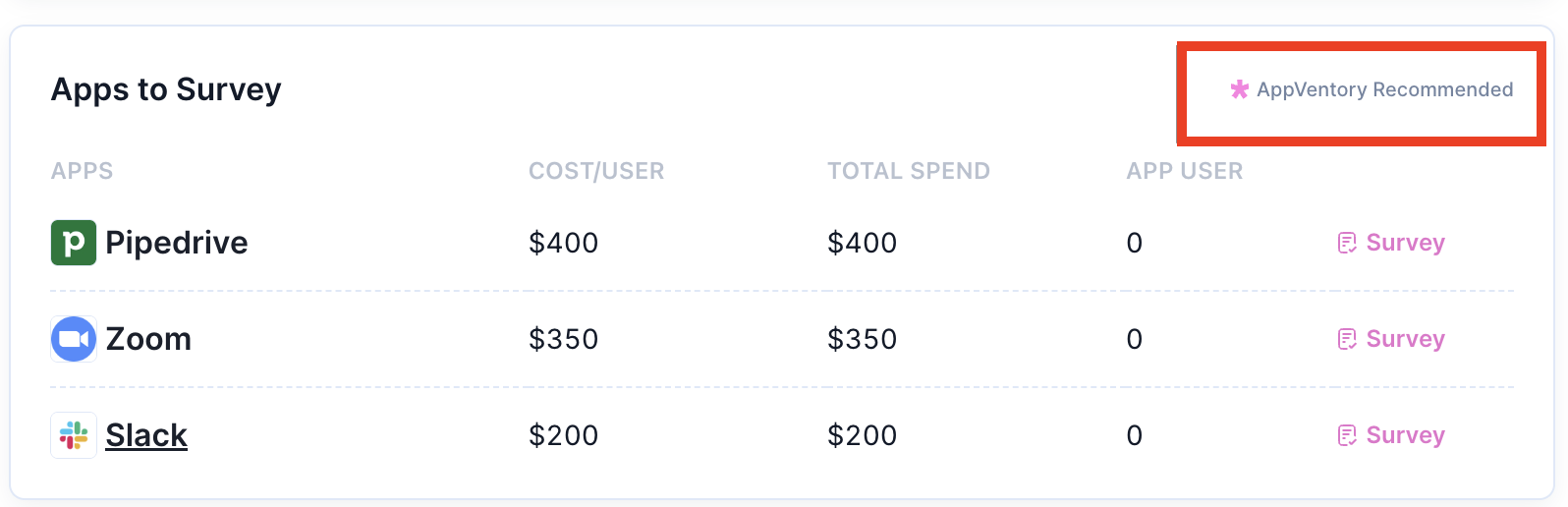 The "AppVentory Recommended" displays the Top 3 apps based on Cost per User.