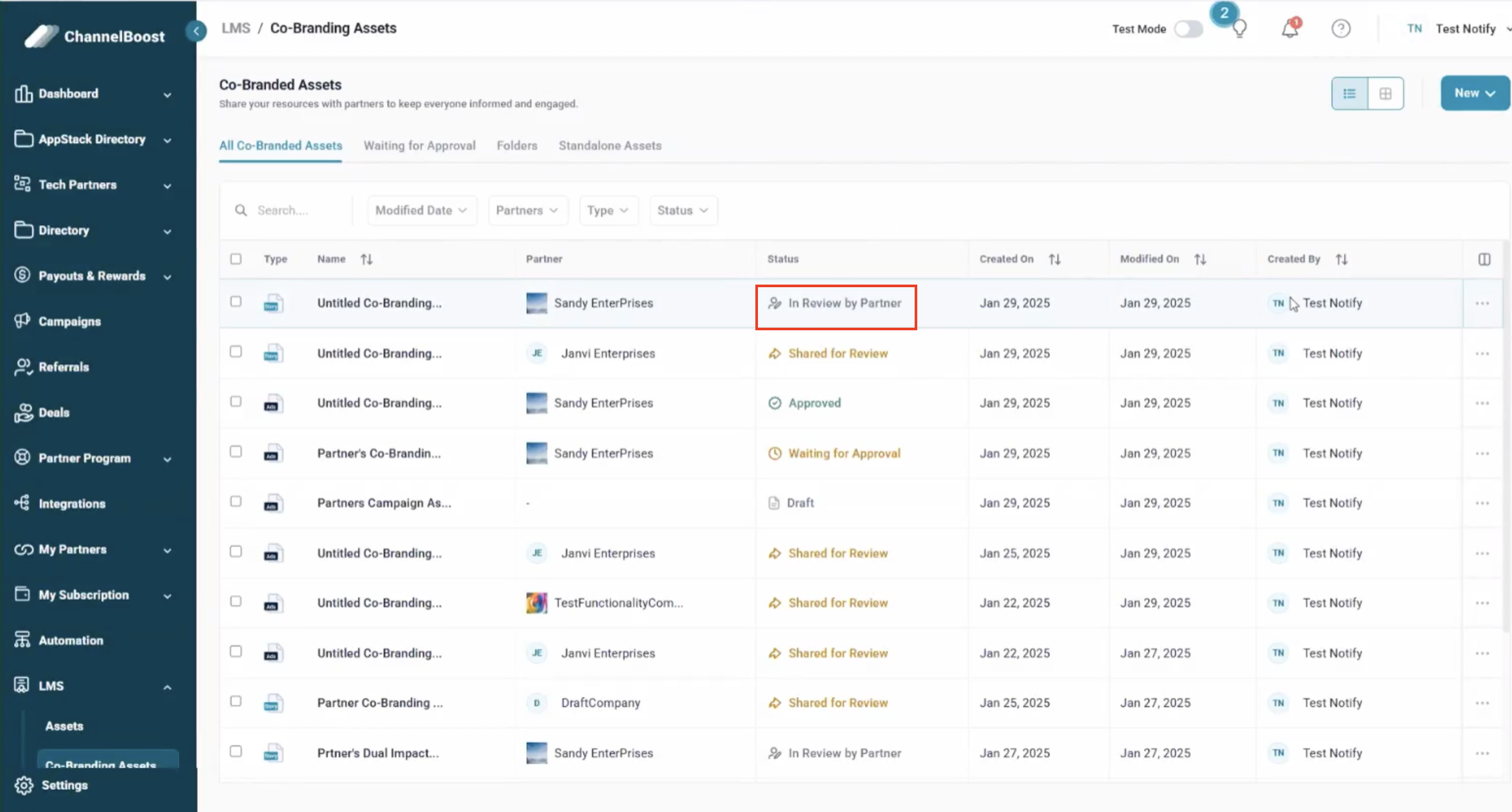 Co-branded assets can now be distributed to multiple partners simultaneously, with an option to enable or disable approval workflows. For trusted relationships, assets may be shared without approval to accelerate distribution; for other partners, standard review and approval steps remain available. - The asset appears in the Shared for Review status until editing begins.