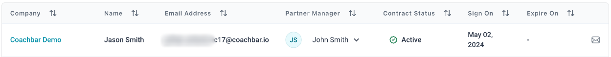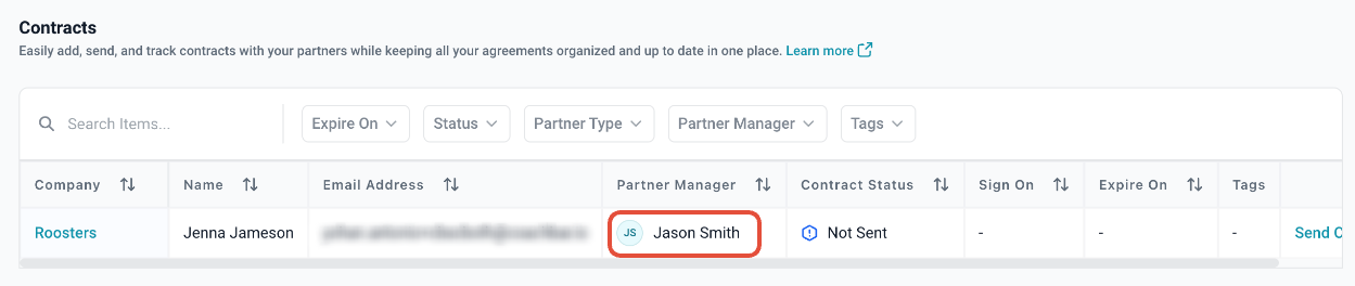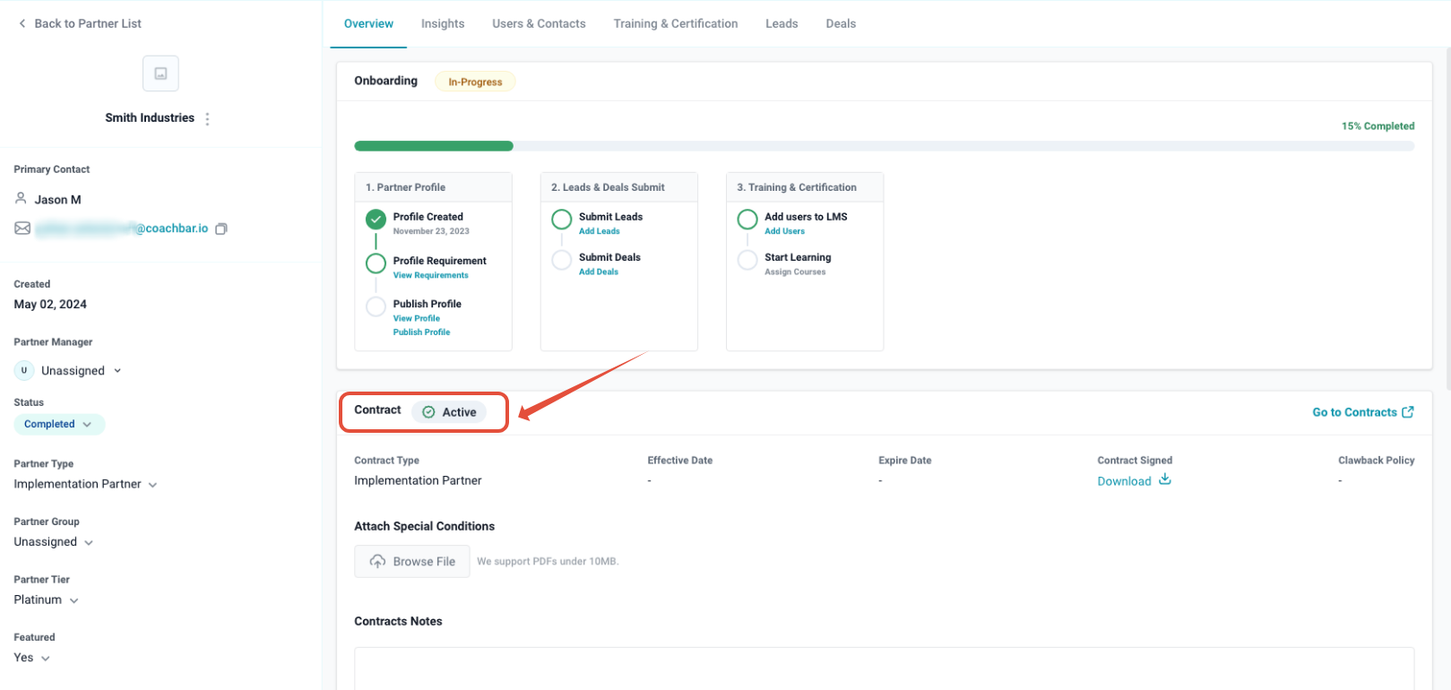 To begin with, you can assign a partner manager to the appropriate partner. Once you have assigned a manager, click on the name of the partner company to review all the information. After reviewing the details, you can upload the contract accordingly.