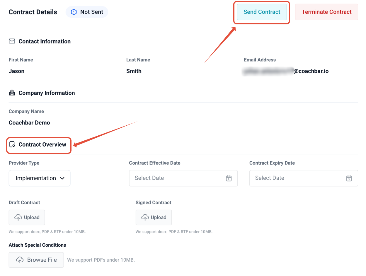 Once you have added all the necessary information, upload the draft contract to the profile. This will automatically send the contract to the partner.
