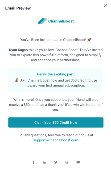 - Via Email: Enter email addresses (comma-separated) and send invitations directly from ChannelBoost.