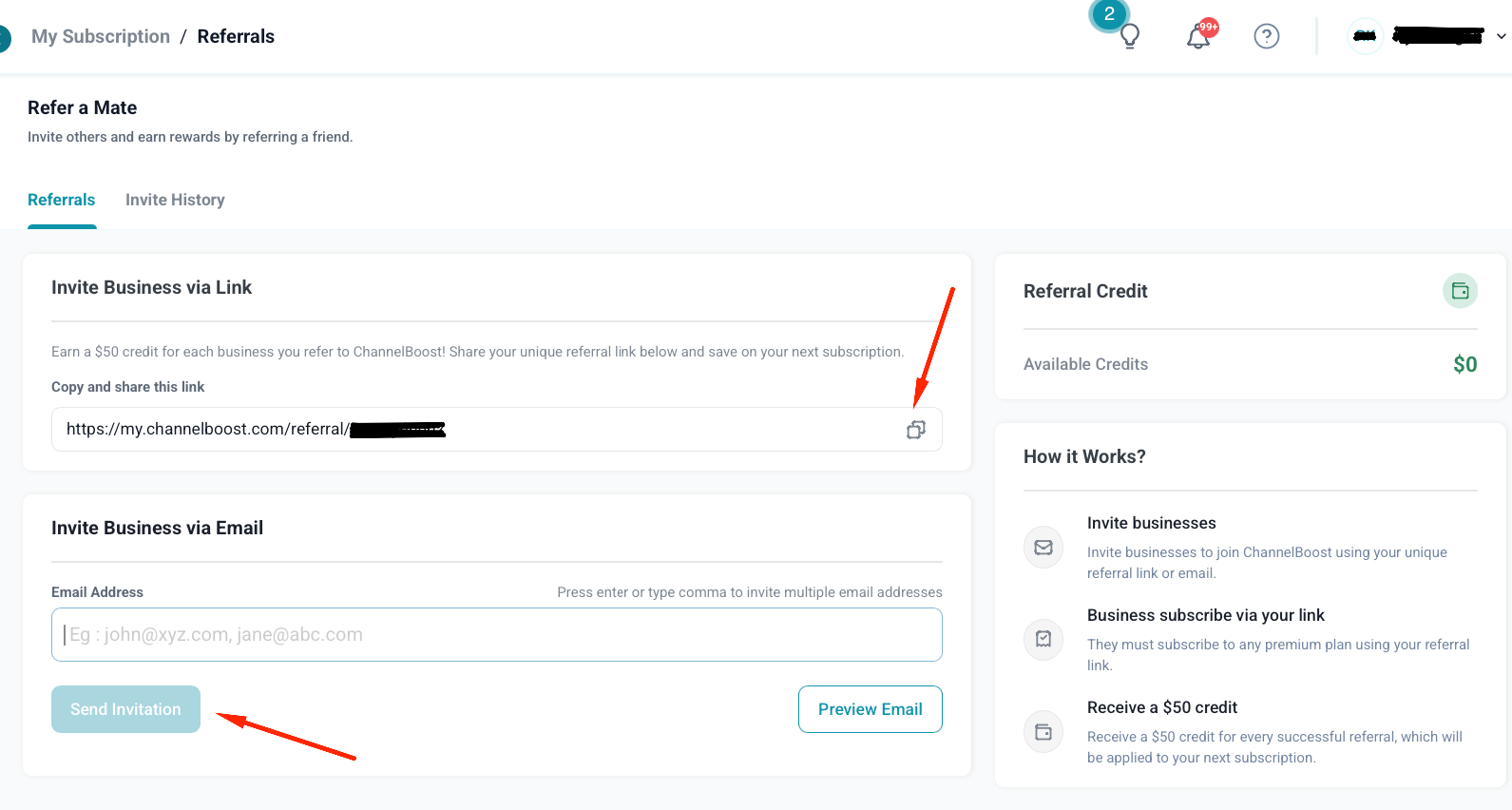 - Once the referred business subscribes, both you and the new user will receive a credit.