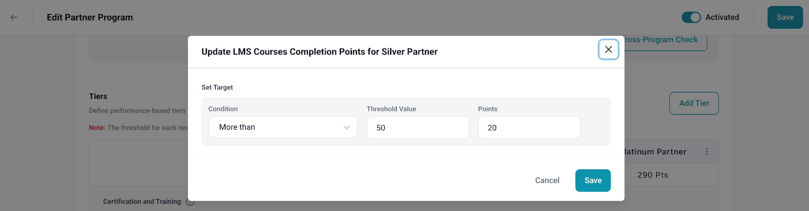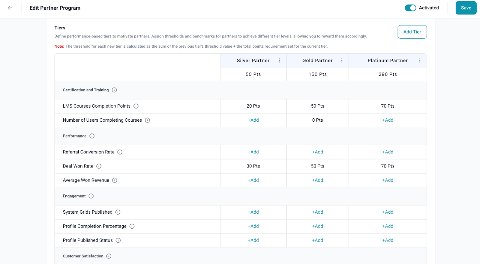 - Tiers: Assign benchmarks and thresholds for each tier. You can select from existing tiers or create new ones to align with your program’s goals.