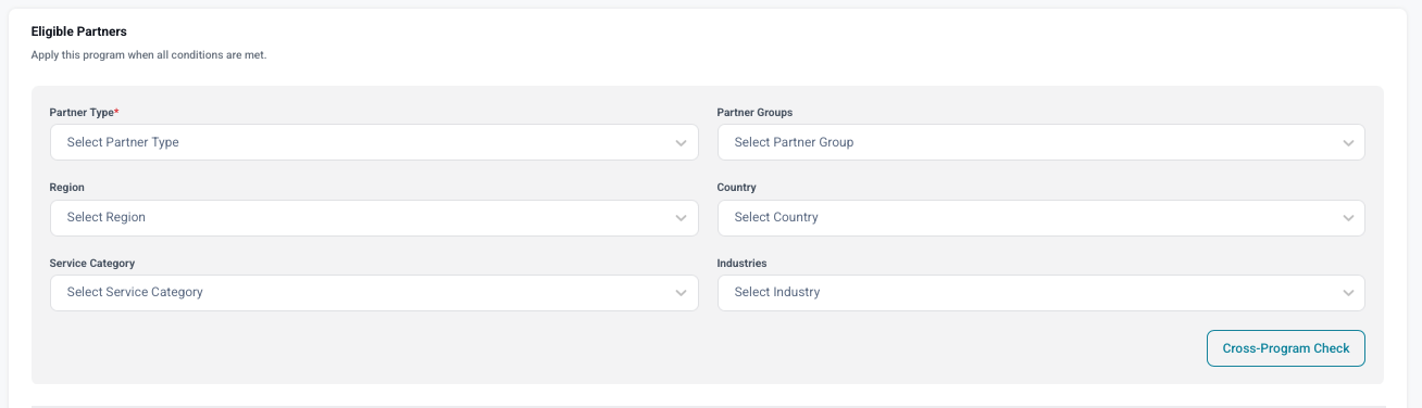 Note: The AND rule applies between these fields. All selected conditions must be met for partners to be eligible for the program.