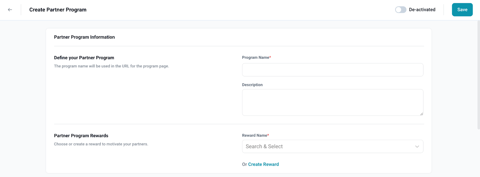 - Reward name*: Search and select an existing reward or create a new one to associate with the program.