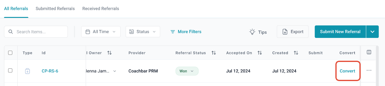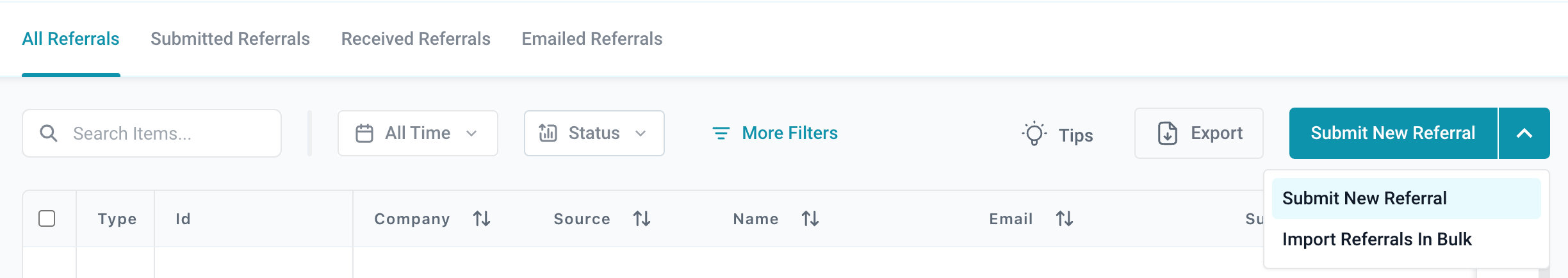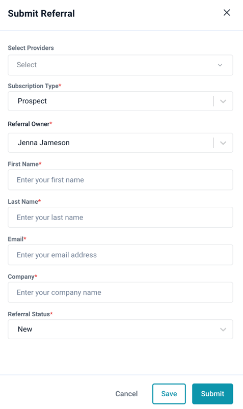 Navigate to the "Referrals" tab and click "Submit New Referral" to add referrals individually or in bulk via CSV.