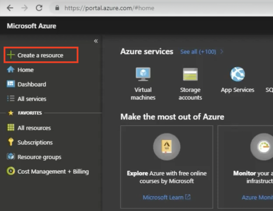 - On the homepage, click Create a Resource (located in the upper-left corner).