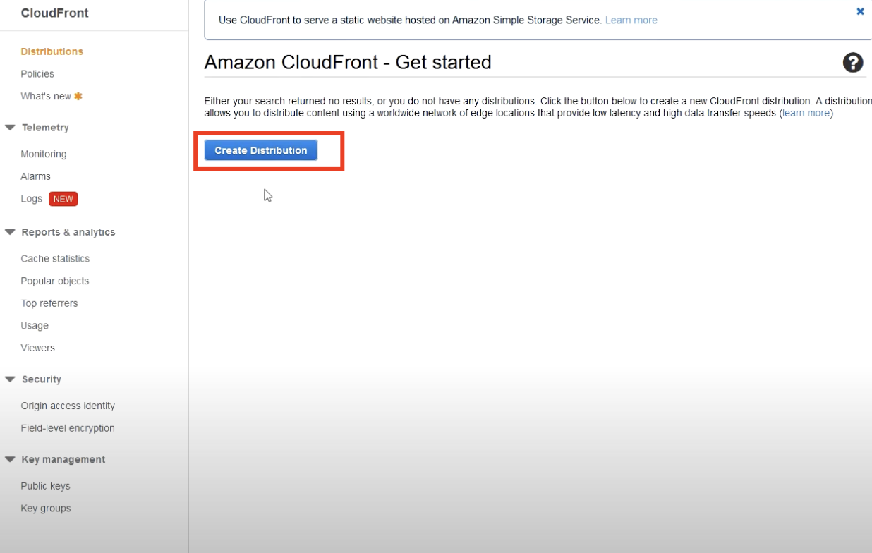 - Click Create Distribution and wait for deployment.