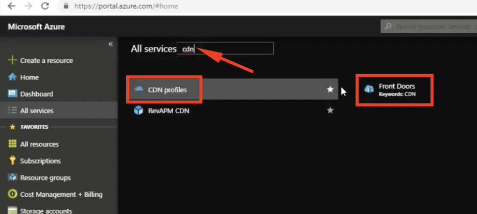 - In the search bar, type Front Door and CDN profiles.