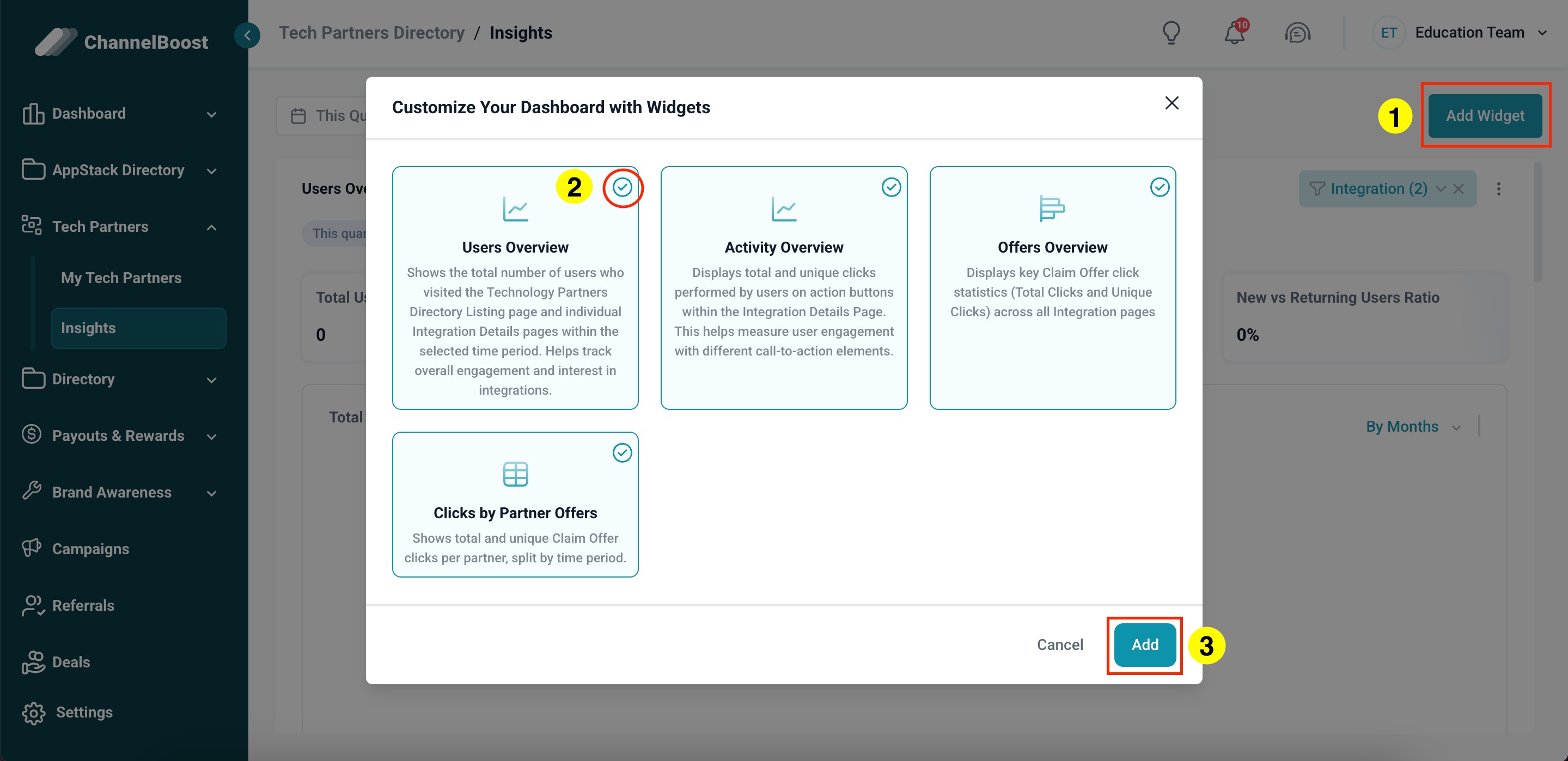 The Insights dashboard helps users monitor engagement and performance of partners and their offers.